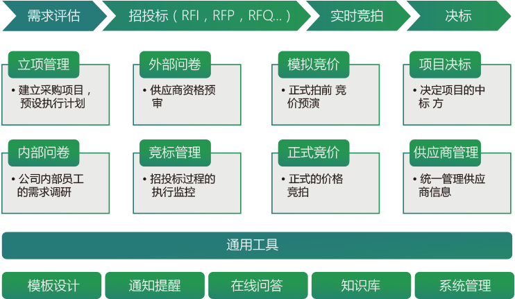 是一个基于互联网的在线寻购管理平台, 提供了网上招投标、反向竞拍、调查问卷、综合排名、决标授标、供应商搜寻、供应商管理、在线沟通等工具, 实现了对招投标全过程的管理, 是一个强大的信息交互门户, 并且建立于S a a S 云计算架构。