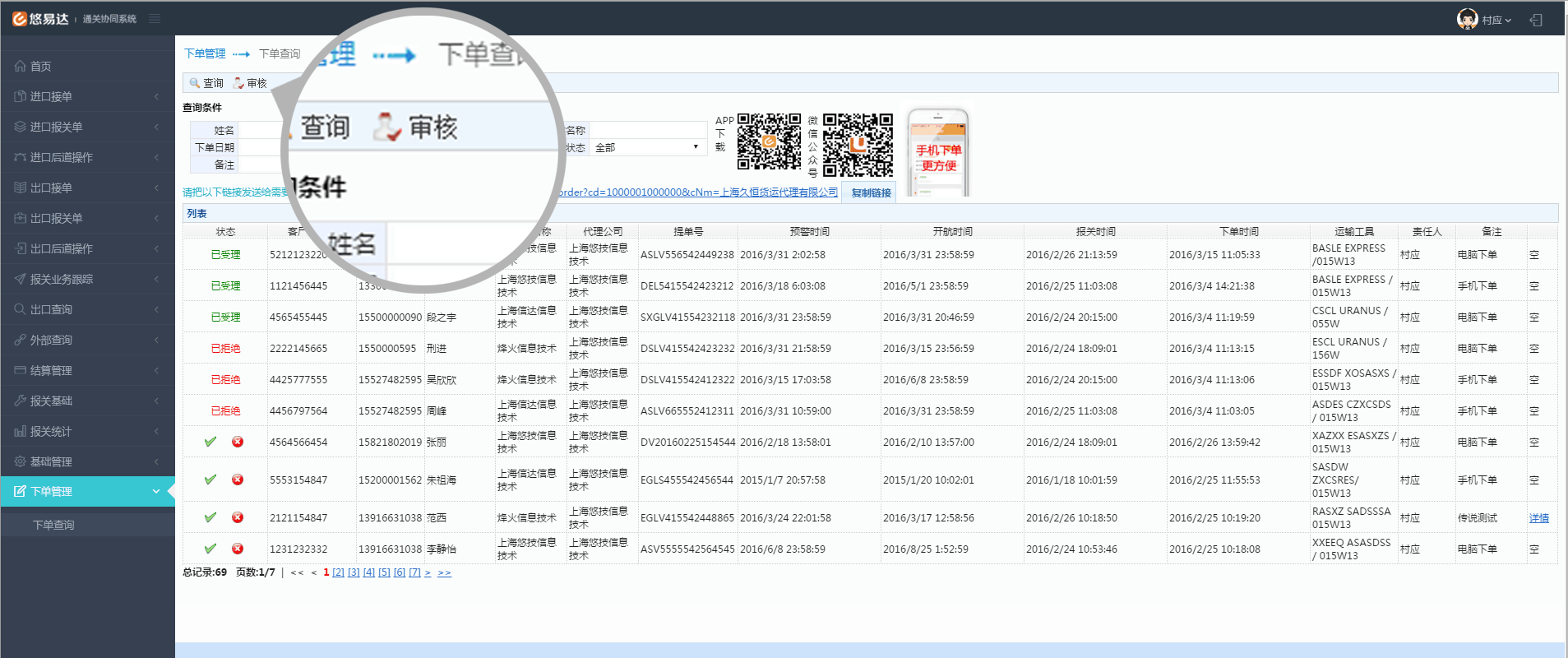 根据下单管理确认过的单证进行接单,操作非常简便,只需输入“海关编号”,其余“客户名称”和“报关时间”在下单确认后自动同步过来,无需再次输入。